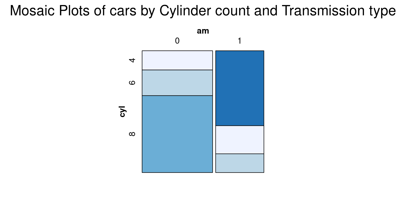library(vcd)is used to import the vcd package which includes the mosaic() function that is superior to the base R mosaicplot() in its handling of labeling and legends.mosaic(\~ cyl + am, data = tb, main = "Mosaic of Cylinder count and Transmission type")creates a mosaic plot.In this command, the formula