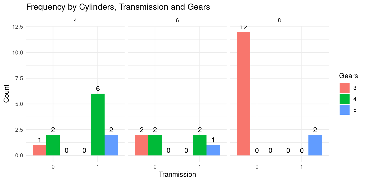 names(count_df) <- c("cyl", "am", "gear", "count"). The ‘count’ column represents the frequency of each combination of the levels of thecyl,am, andgearvariables.The plot is created using the
