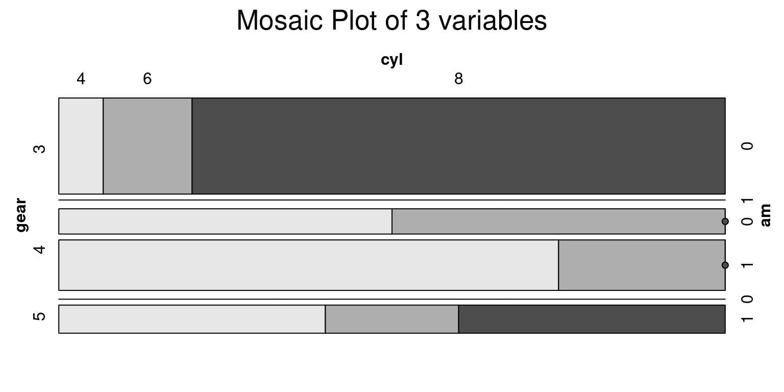 vcd::mosaic(~gear+cyl+am, data = tb, main = "Mosaic of Gears, Cylinders and Transmission type", shade = TRUE, highlighting = "cyl" )generates the mosaic plot. The~gear+cyl+amformula indicates that the mosaic plot should visualize thegear,cyl, andamvariables.data = tbspecifies the dataset to be used, which istbin this case.main = "Mosaic of Gears, Cylinders and Transmission type"sets the main title of the plot.shade = TRUEmeans that shading is applied to the cells in the plot. The shading can help to differentiate the cells visually based on the residuals from a model of independence.highlighting = "cyl"means that thecylvariable’s levels will be distinctly colored. This highlighting helps to visually emphasize the differences amongcylcategories in the plot. [7]